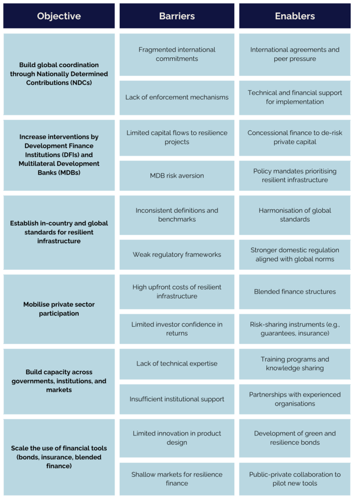 This section sets out a practical roadmap for scaling climate finance for resilient infrastructure. Unlike other Altiorem Expert Guides that focus on immediate organisational action, this guide addresses systemic stakeholders. Drawing on expert practice, it outlines practical actions, identifies barriers and enablers, and sets impact markers that reflect progress.