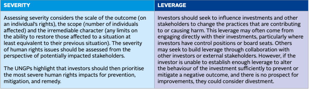 Practically, this also means adopting core UNGP concepts such as severity (scale, scope and irremediability) and leverage, which helps investors identify the most serious risks to people and determine appropriate responses.