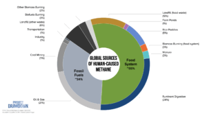 The food system contributes methane along the entire supply chain, from farm to landfill, including from cattle, manure, rice farming, biomass burning, and food waste. When combining all of these links in the chain together, it is responsible for over 210 million tons of methane, more than half of global human-caused emissions, making food systems the largest source of the superpollutant.