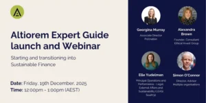 Join us for the launch of another Altiorem Expert Guide on a Sustainable Finance topic, developed by industry expert, Matthew Coghlan and Altiorem team, with support from one of Altiorem’s Research Associates, Ella Taylor.