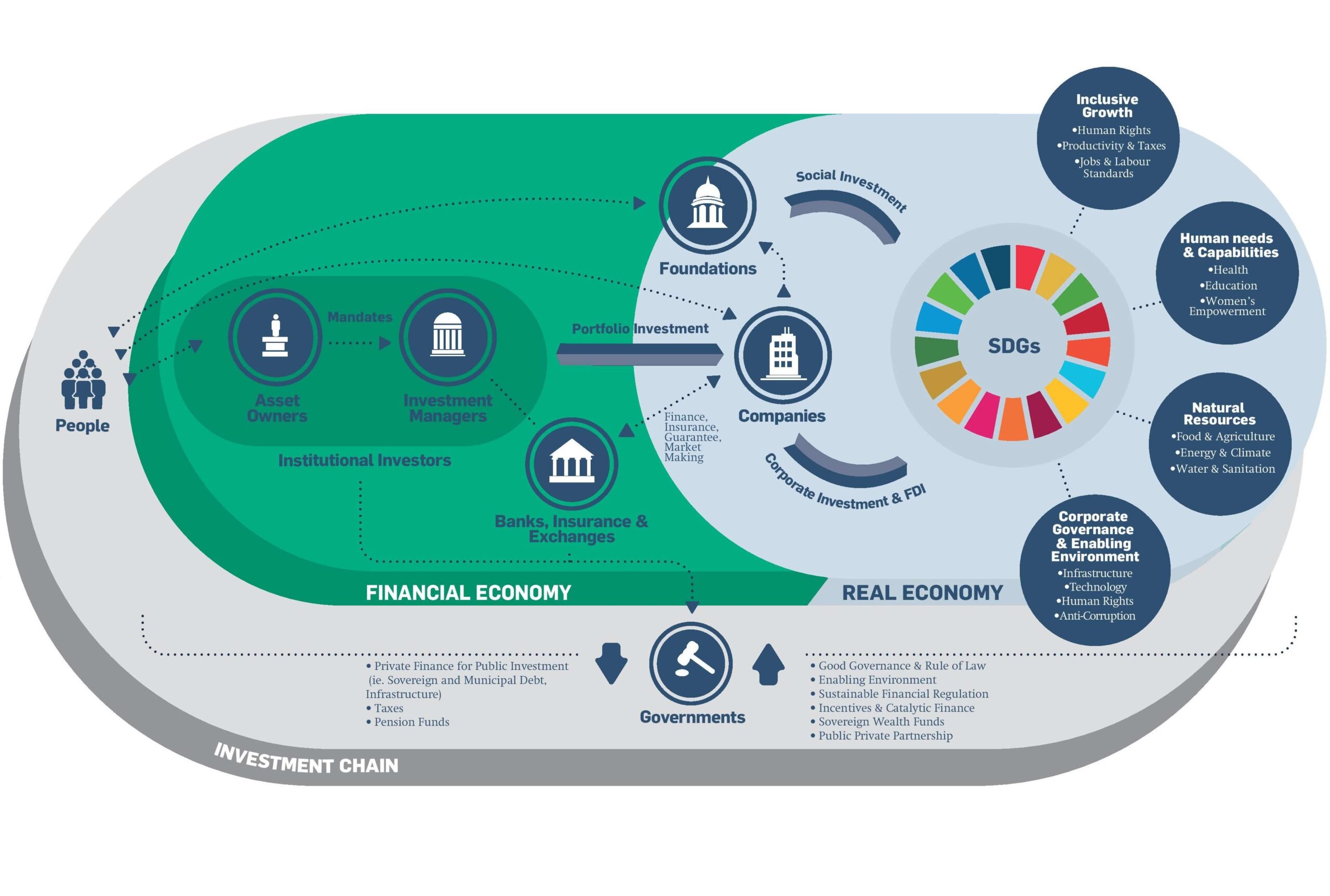- Institutional investors, banks, insurance organisations, stock exchanges, governments, the UN, foundations and all companies are given important guidance on how they can each help with SDG achievements through a list of the many potential actions that they can take.