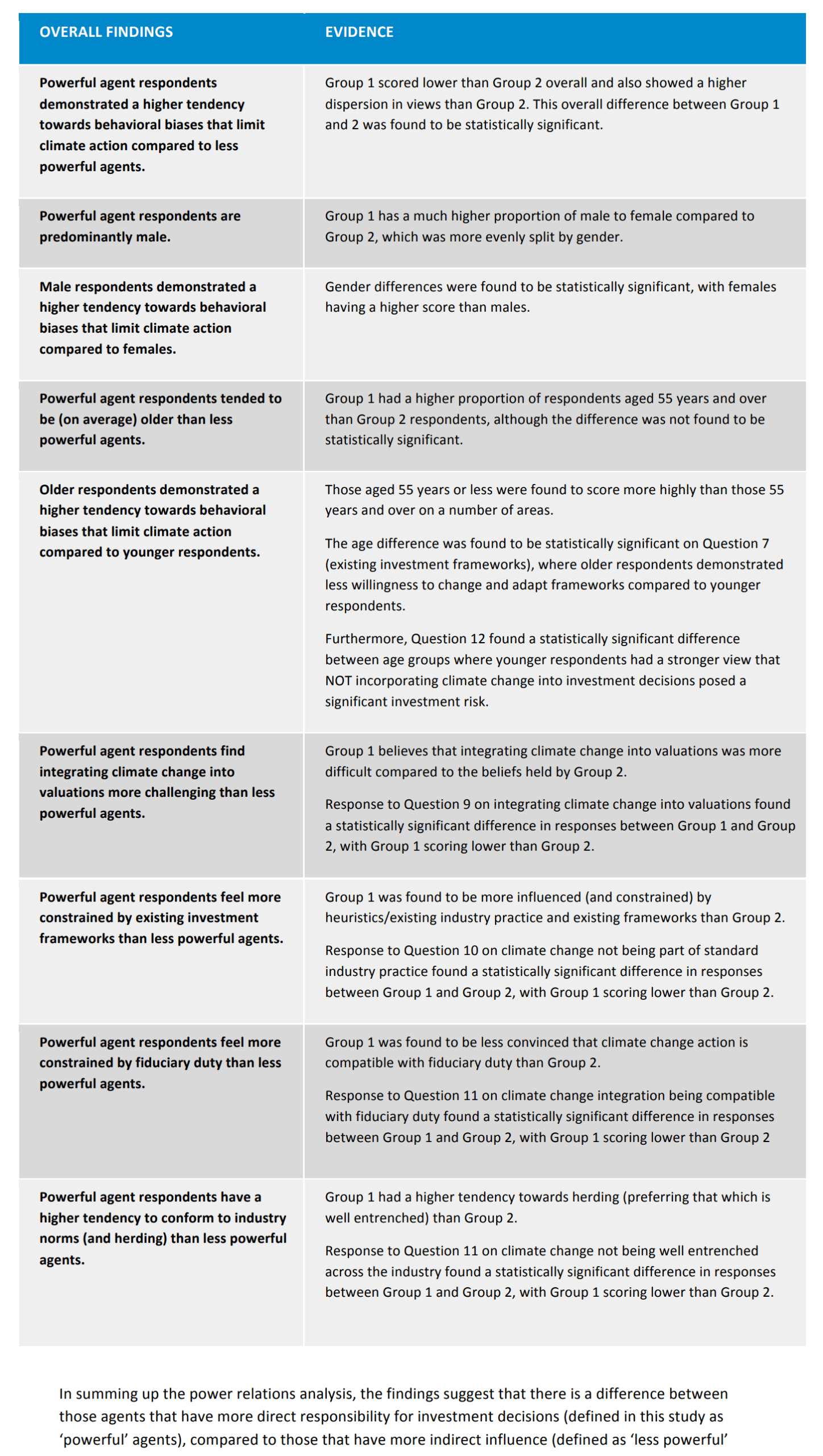 Overall, the research found evidence of cognitive biases and psychological underpinnings for these, including across the areas that were the focus of this study, namely myopia, herding, and reliance on heuristics and rules of thumb. There was general acknowledgement of climate change as a systemic risk, but at the day-to-day level, there is a degree of separation from the issue in terms of what that means in practice. There is a degree of resistance to change to existing frameworks, it takes time, energy, and motivation to see it through, which may not be present at the individual level or across organisations. Finally, half the respondents believe that failure to act on climate change would not result in a less diversified portfolio which does not align with forecast impact of climate change on key sectors.