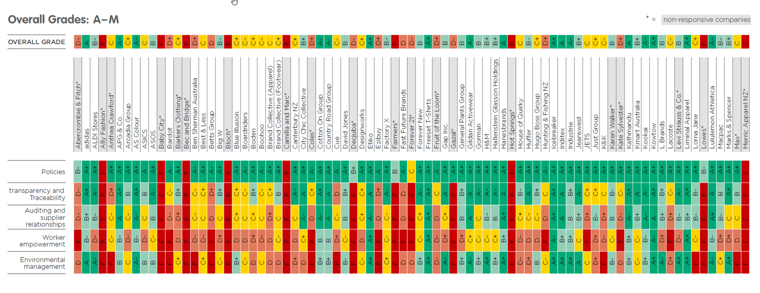 The 2019 Ethical Fashion Report grades 130 companies from A+ to F, based on the strength of their systems to mitigate against the risks of forced labour, child labour, and exploitation in their supply chains. Since last year, improvements have been made across the fashion industry in 79% of the areas assessed. Most noteworthy areas of improvement in 2019 are: