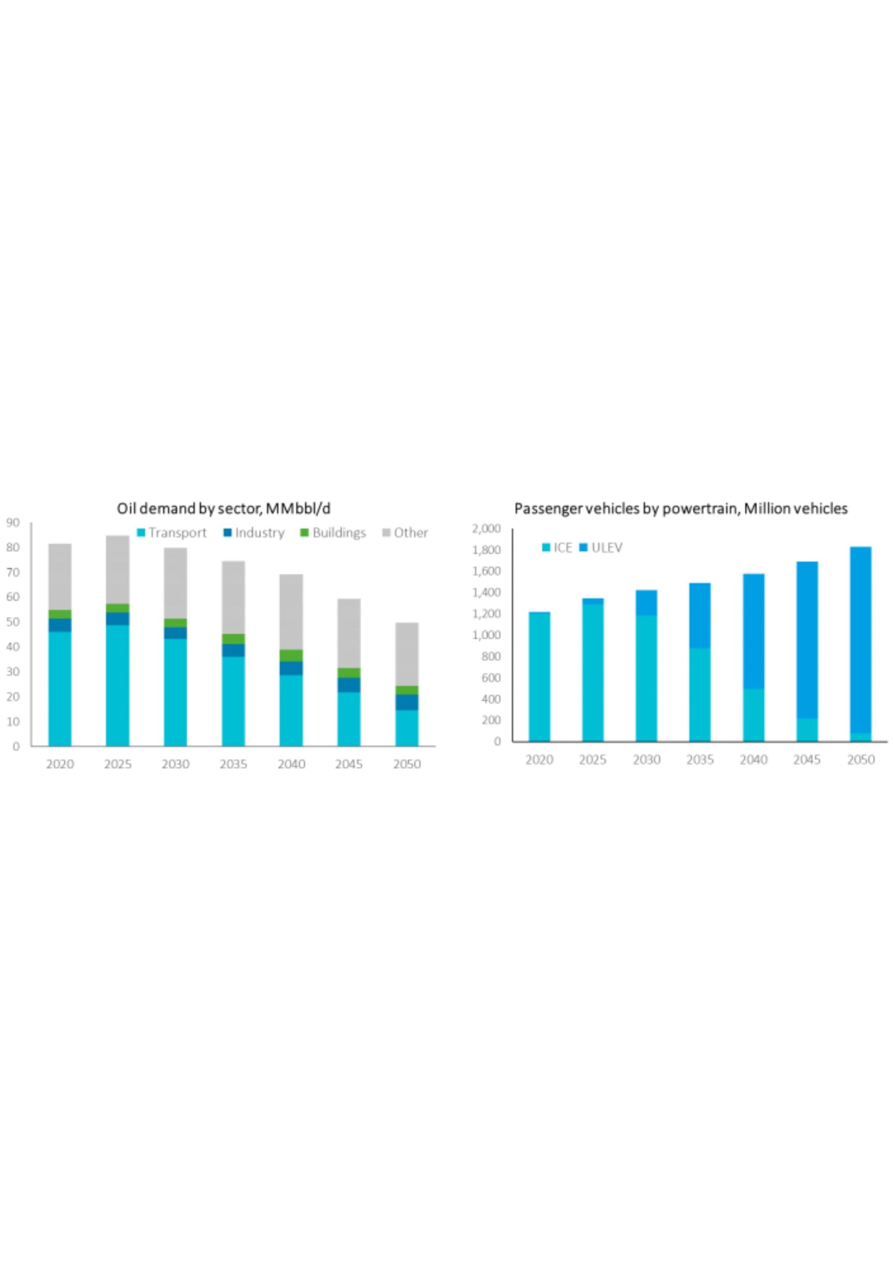 Oil demand remains flat due to improving internal combustion efficiency but uptake of electric vehicles results in total oil demand falling by 40% between 2025-2050.