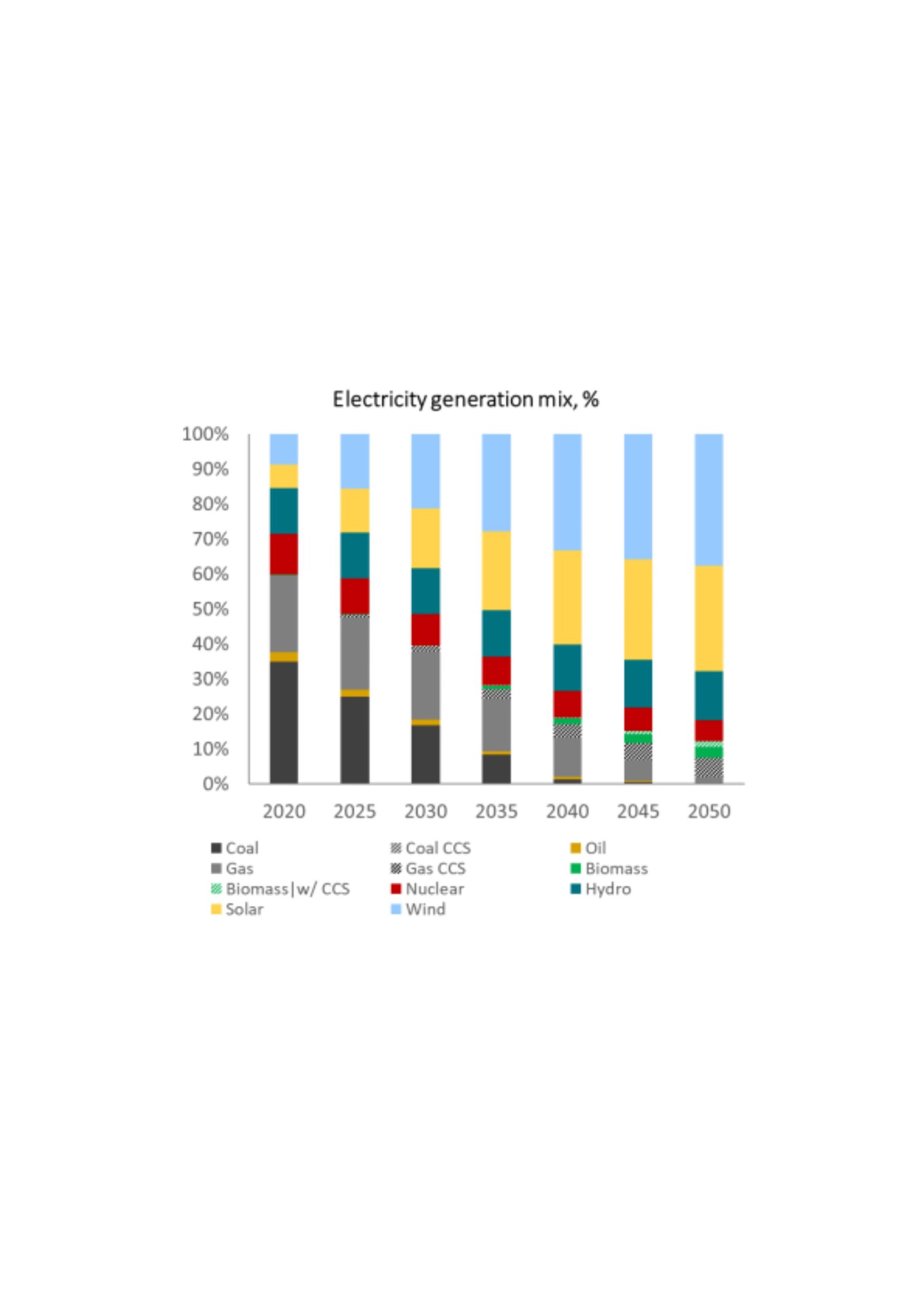 Renewable generation is expected to be responsible for 74% of electricity generation by 2040, with solar and wind alone generating approximately 2/3 of all electricity in 2050. Coal is phased out completely while gas retains a minor role, as fossil fuels are expected to be virtually phased out by 2050.